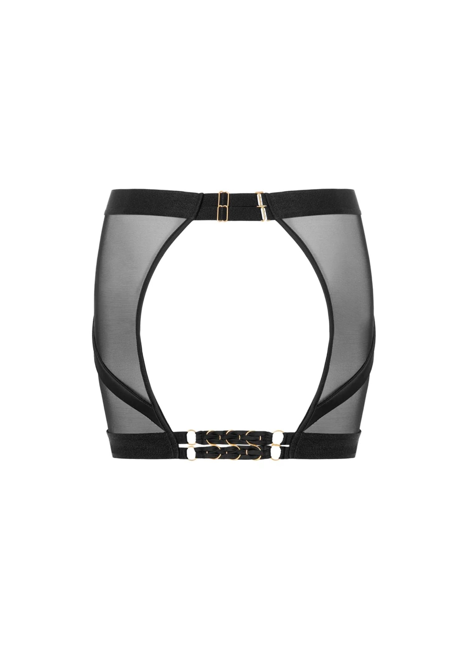 Dare to bare with the Suri Open-Back Skirt—where playful confidence meets daring design. This black mesh beauty features a soft, sheer front that gives way to an unexpectedly bold open back, complete with directional straps and satin threading woven through gleaming gold hoops. The adjustable swan hook fastening ensures a custom fit, making this the ultimate statement piece for those ready to turn heads and break the rules